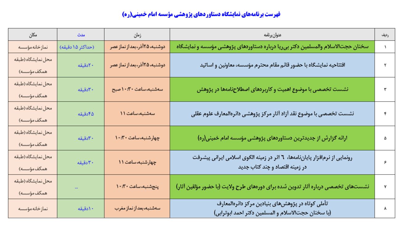 این نمایشگاه تا 28 آذرماه 1398 همه روز از ساعت 10 تا 14 و 16تا19 در موسسه آموزشی پژوهشی امام خمینی(ره) دائر می باشد.
