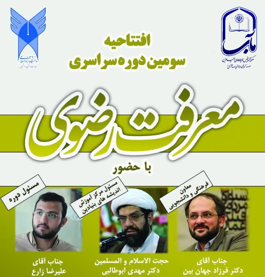 در افتتاحیه این دوره حجت الاسلام والمسلمین مهدی ابوطالبی رئیس مرکز آموزش اندیشه های بنیادین(مآب)،دکتر فرزاد جهان بین معاون فرهنگی و دانشجوئی دانشگاه آزاد اسلامی و جناب آقای علیرضا زارع مسئول دوره معرفت رضوی 3 بصورت پخش زنده سخنرانی کردند.