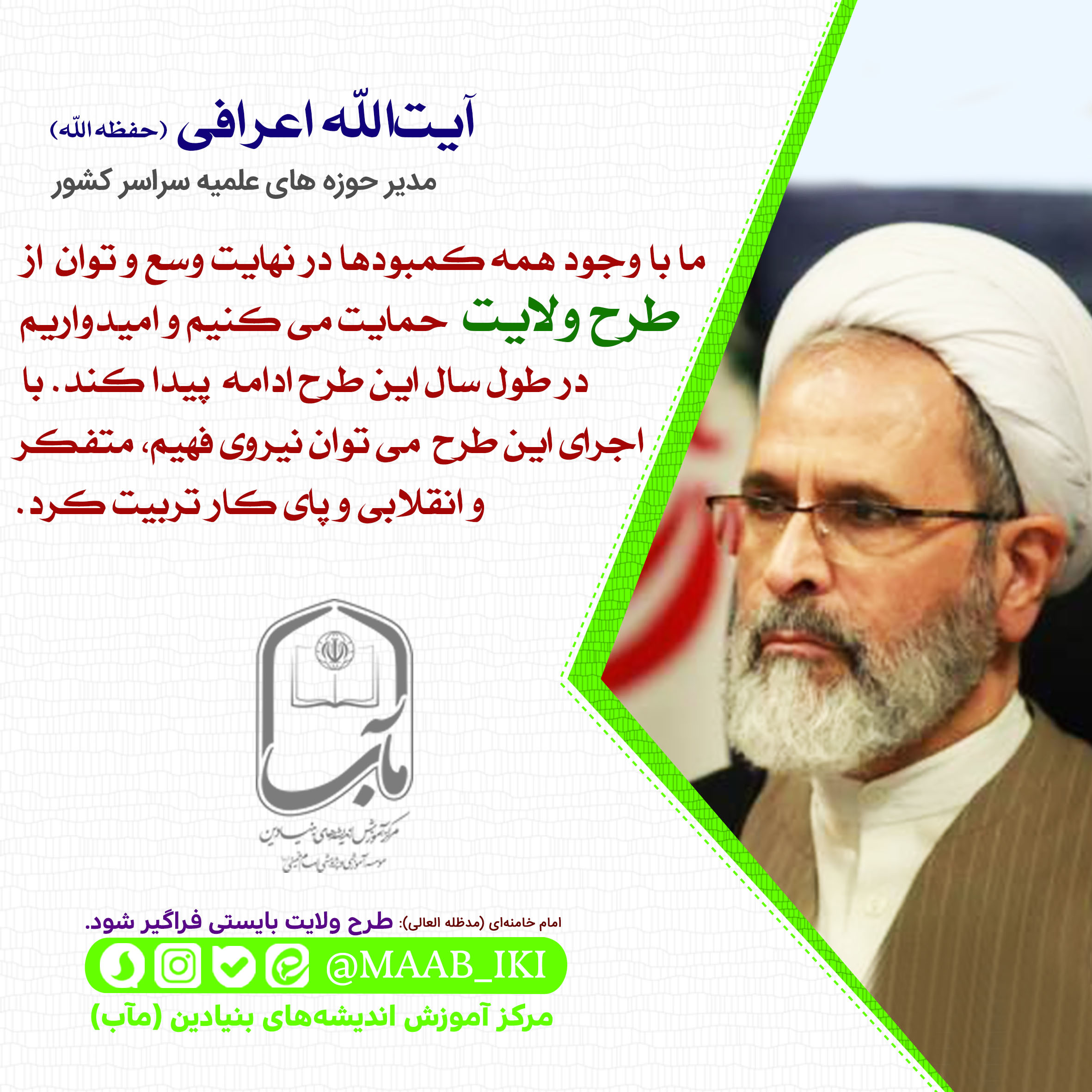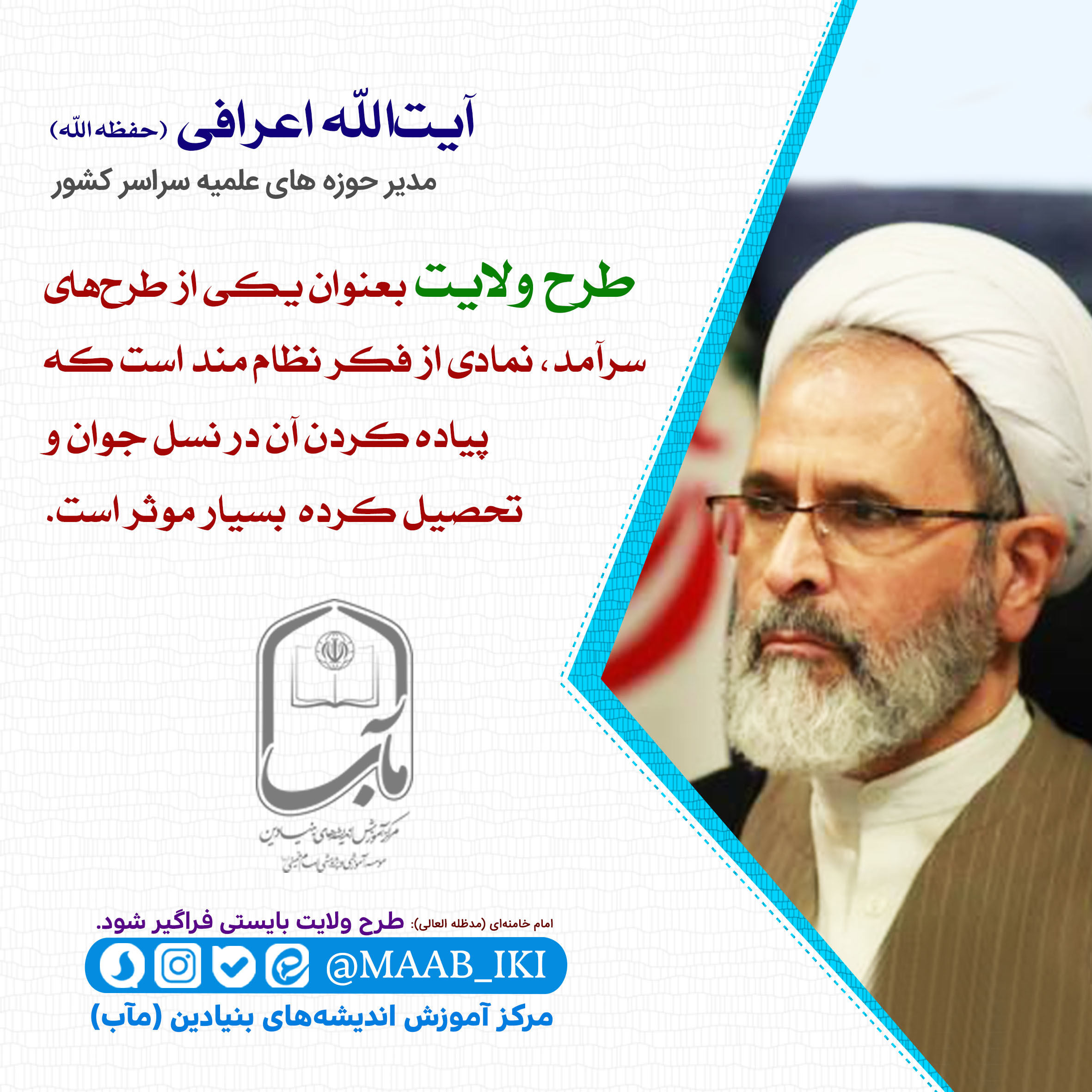 آیت الله اعرافی گفت:طرح ولایت بعنوان یکی از طرحهای سرآمد، نمادی از فکر نظاممند است که پیاده کردن آن درنسل جوان و تحصیل بسیار موثر است.
