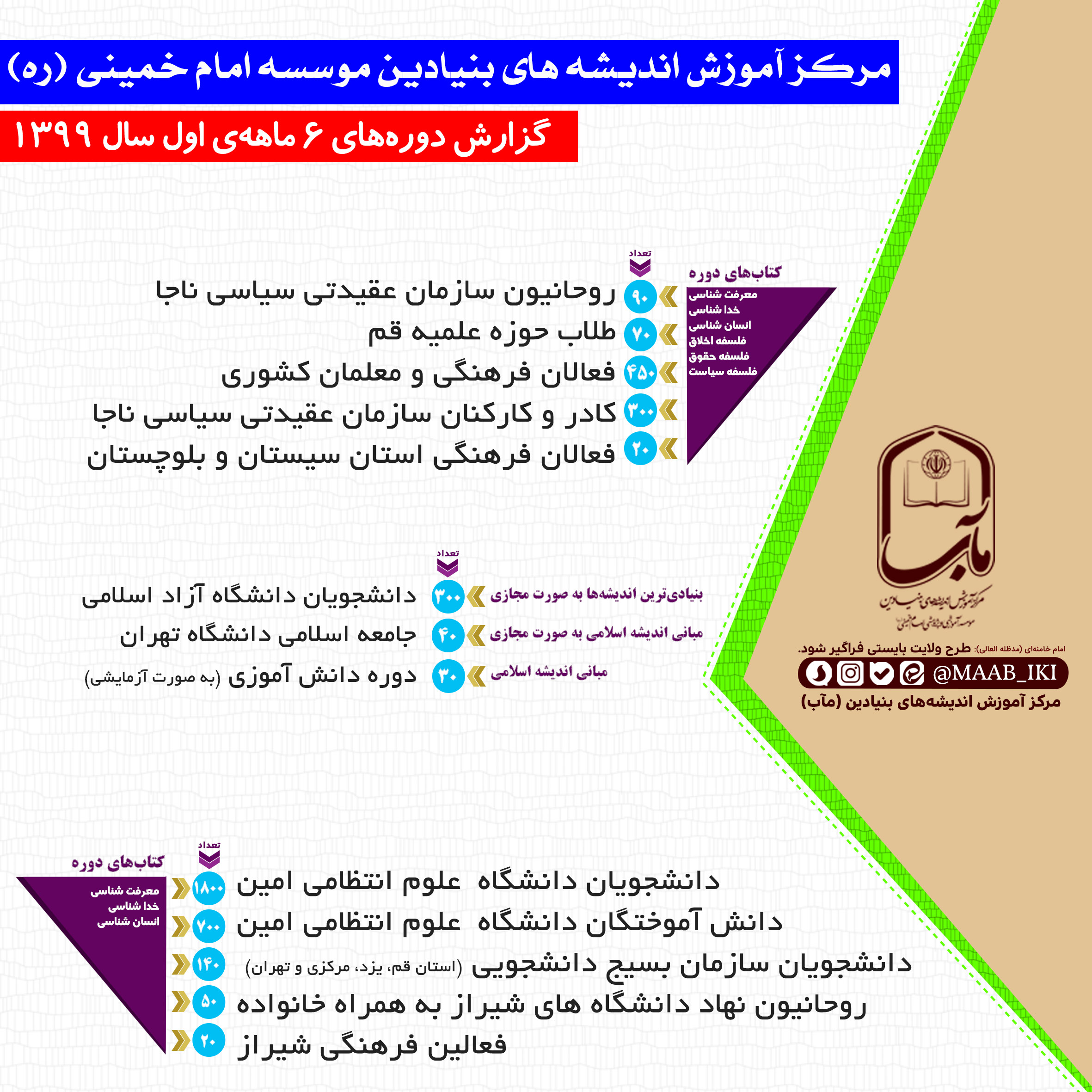 به گزارش روابط عمومی مرکز آموزش اندیشه های بنیادین(مآب) با توجه به برگزاری دوره های طرح ولایت با رعایت پروتکل های بهداشتی در ۶ ماهه اول سال ۹۹ درخواستهای متعددی برای برگزاری طرح ولایت در نقاط مختلف کشور بود که از میان این درخواستها در این مدت موارد زیر برگزار شده است: