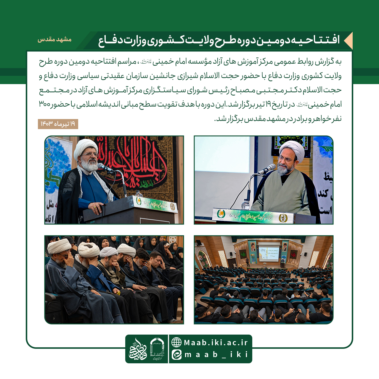 به گزارش روابط عمومی مرکز آموزش های آزاد مؤسسه امام خمینی (قدس سره)، مراسم افتتاحیه دومین دوره طرح ولایت کشوری وزارت دفاع با حضور حجت الاسلام شیرازی جانشین سازمان عقیدتی سیاسی وزارت دفاع و حجت الاسلام دکتر مجتبی مصباح رئیس شورای سیاستگزاری مرکز آموزش های آزاد در مجتمع امام خمینی(قدس سره) در تاریخ ۱۹ تیر برگزار شد.