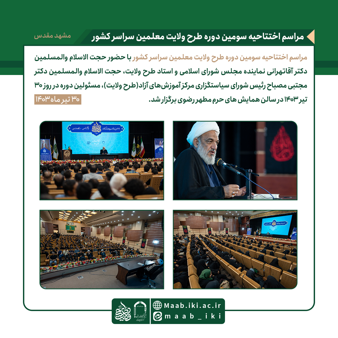 مراسم اختتاحیه سومین دوره طرح ولایت معلمین سراسر کشور با حضور حجت الاسلام والمسلمین دکتر آقاتهرانی نماینده مجلس شورای اسلامی و استاد طرح ولایت، حجت الاسلام والمسلمین دکتر مجتبی مصباح رئیس شورای سیاستگزاری مرکز آموزشهای آزاد(طرح ولایت)، مسئولین دوره در روز ۳۰ تیر ۱۴۰۳ در سالن همایش های حرم مطهر رضوی برگزار شد.