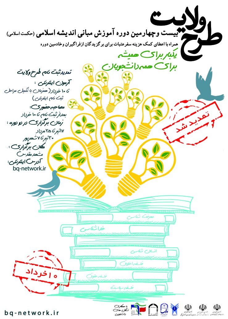 بیست و چهارمین دوره طرح ولایت دانشجویی در مشهد مقدس و در دو بازه زمانی 40 روزه در تاریخ «17 تیر تا 25 مرداد» و «30 تیر تا 7 شهریور» برای خواهران و برادران دانشجو برگزار می شود.