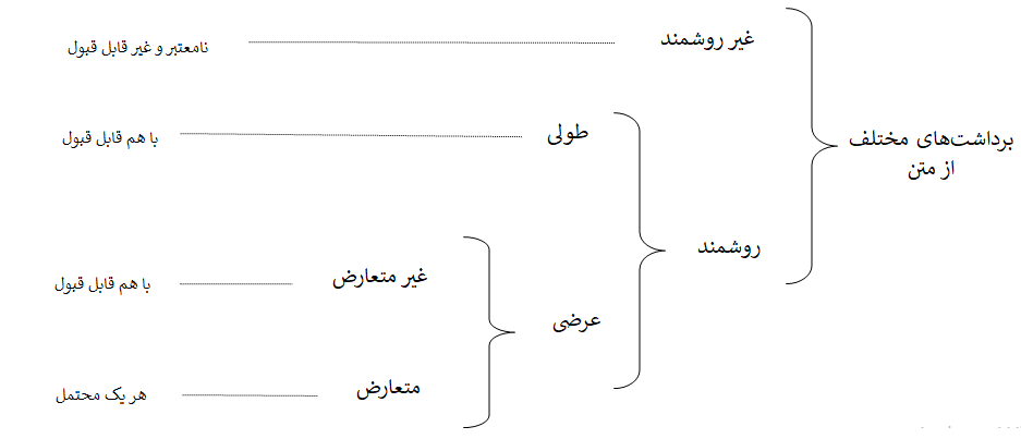 3. معنای اعتبار برداشتهای مختلف: اعتبار برداشتهای روشمند نیز به معنای مطابقت قطعی آنها با واقع نیست، بَلْ به این معناست که در مواردی که متنْ نص نیست، یعنی معنای آن به طور یقینی معلوم نیست، هر معنایی که با روش استنباط معتبر، از متن به دست آمده باشد، محتمل است، و به عنوان یک نظریه، که امکان مطابقت با واقع را دارد، پذیرفتنی است.