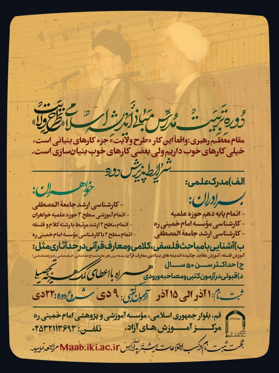 مرکز آموزشهای آزاد، موسسه آموزشی و پژوهشی امام خمینی قدسسره در راستای عمل به فرمایشات مقام معظم رهبری مبنی بر ضرورت فراگیر شدن طرح ولایت و به منظور تکمیل کادر اساتید طرح ولایت، برای پانزدهمین دوره تربیت مدرس مبانی اندیشه اسلامی(طرح ولایت) از میان طلاب فاضل پذیرش می نماید.